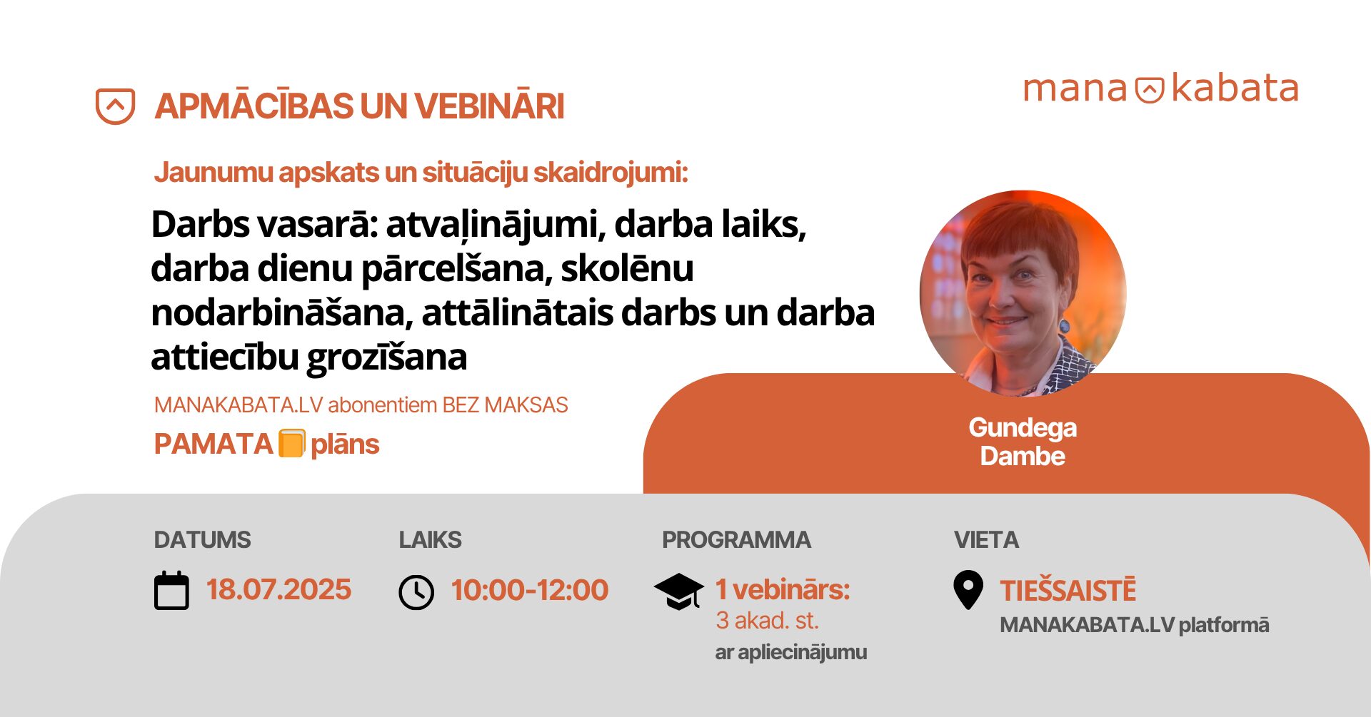 Darbs vasarā: atvaļinājumi, darba laiks, darba dienu pārcelšana, skolēnu nodarbināšana, attālinātais darbs un darba attiecību grozīšana, Gundega Dambe